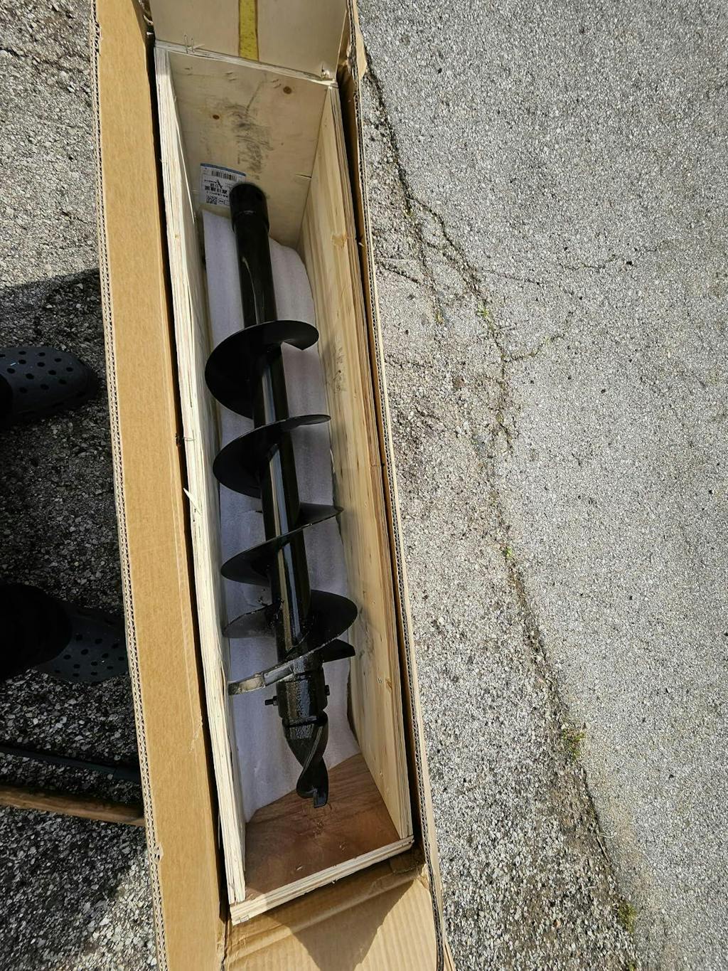 Auger arrived today packaged inside a cardboard box inside a wooden box safe and sound. Can't wait to use it.