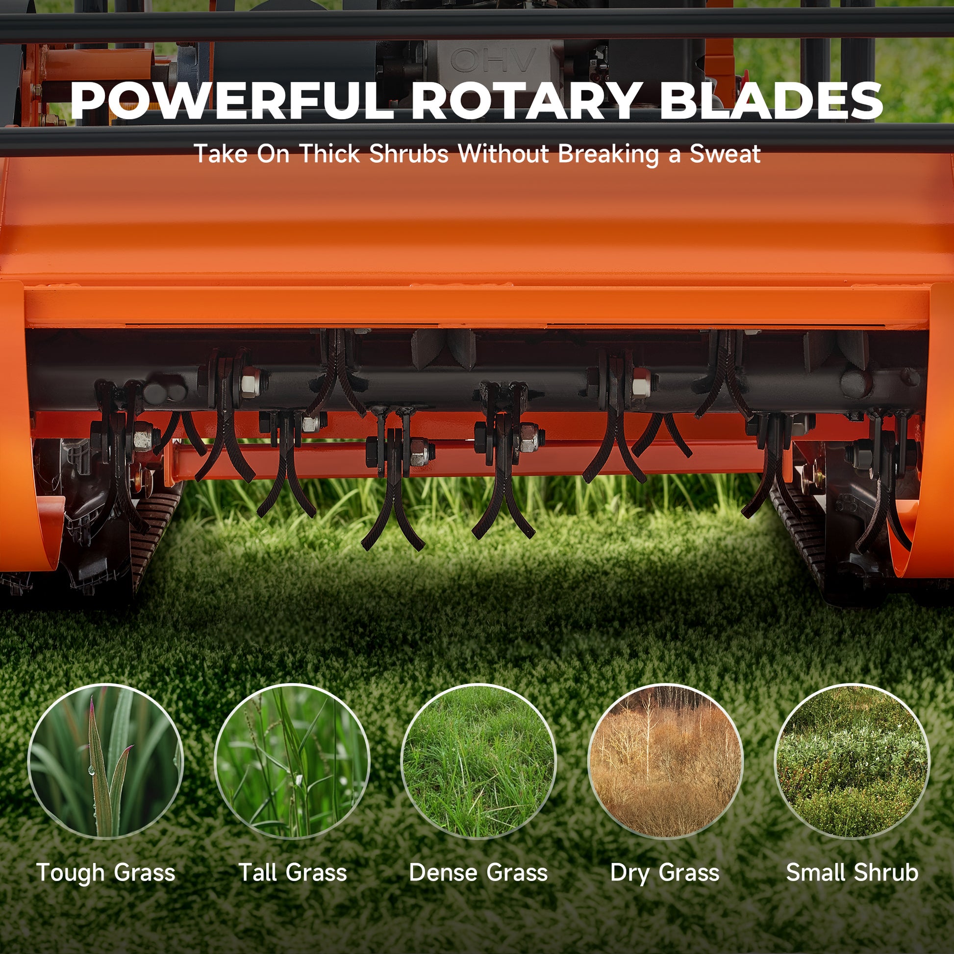 Our mower features 20 sets of durable carbon steel rotary blades (40 blades total) designed for a smooth, clean cut that handles even thick grass and small shrubs with ease. The powerful cutting action can break down tough vegetation, leaving your lawn perfectly manicured. With easy-to-maintain blades that can be swapped without flipping the machine, you’ll save time and reduce maintenance costs while ensuring long-lasting performance and powerful results on every mow.